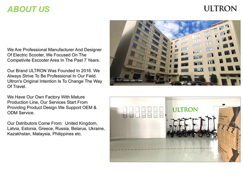 We are a brand that creates high-performance electric scooters designed for off-road adventures while also being friendly to the environment. Their scooters feature eco-friendly elements such as rechargeable lithium-ion batteries and energy-efficient motors. The company's commitment to sustainability is reflected in its use of clean, renewable energy and its focus on products that create a low carbon footprint. We are committed to reducing its environmental impact and promoting sustainable practices in the manufacture and use of its products. Whether you're looking for an adventurous outdoor experience or an eco-friendly mode of transportation, ultron has the scooter for you.